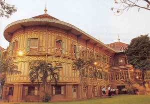 Abhisek Dusit Throne Hall (The Support Museum) a one storey teak building built in the reign of King Rama V, is situated on the east wing of Vimanmek Throne Hall. Abhisek Dusit Throne Hall is now Thailand's first handicraft museum where Her Majesty The Queen collects handicraft masterpieces created by members of Support Foundation . In the museum, visitors find such handicrafts as niellowares Thai silk with various unique designs,"Lipao"basketry like beautiful trays, handbags studded with jewels in different designs such as green beetle.